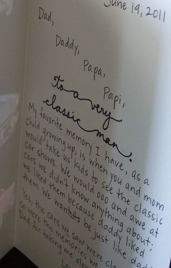 On each car I wrote a word with sharpie. Together they read, “happy father’s day.” Inside I wrote, “to a very classic man” also in sharpie.